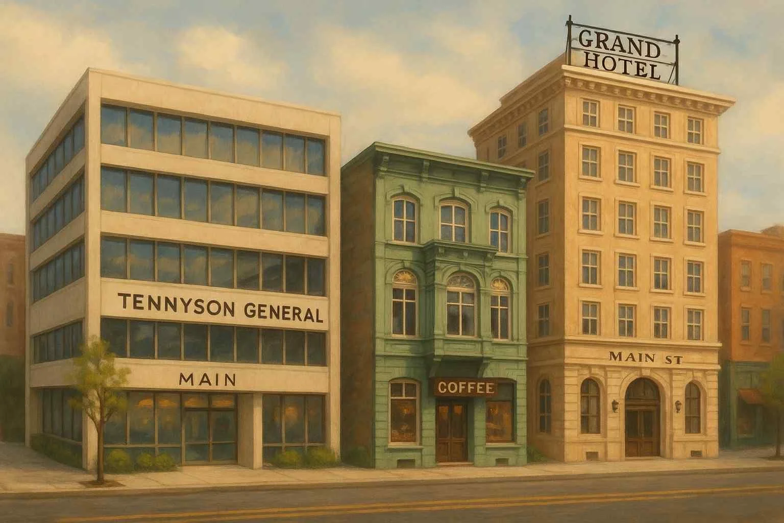 Block with The Mean Bean coffeehouse, Tennyson General Hospital, and The Grand Hotel.
